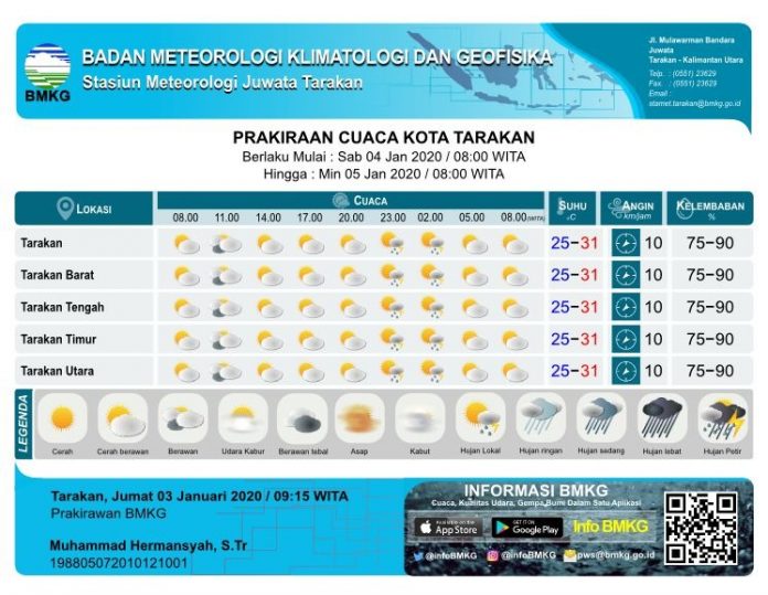“Ketinggian gelombang hingga tiga hari ke depan berkisar antara 1,25 – 2,5 meter di perairan Kaltara dan Sulawesi Barat dengan kategori sedang,” kata Hermansyah selaku Prakirawan BMKG Tarakan.