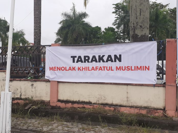 KAYANTARA.COM, TARAKAN – Karena dianggap meresahkan masyarakat, spanduk yang terpasang di sejumlah titik dengan tulisan ‘Tarakan Menolak Khilafatul Muslimin’ akhirnya dilepas secara paksa oleh Satpol PP Tarakan.