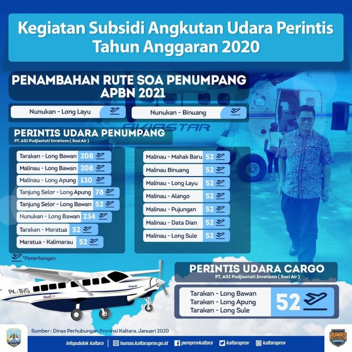 KAYANTARA.COM, TANJUNG SELOR – Guna memenuhi kebutuhan penerbangan ke wilayah pedalaman, Dinas Perhubungan (Dishub) Kaltara, kembali mengusulkan penambahan rute penerbangan subsidi ongkos angkut (SOA) penumpang. Usulan tersebut disampaikan untuk SOA penumpang tahun 2021 melalui Kementerian Perhubungan (Kemenhub).