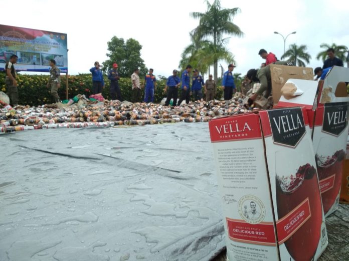 KAYANTARA.COM, MALINAU – Satuan Polisi Pamong Praja, Linmas dan Damkar Kabupaten Malinau memusnahan sebanyak 12 ribu lebih minuman keras (miras) di halaman Stadion Utama Malinau, Jumat (20/3), pagi tadi.