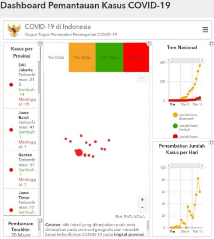 KAYANTARA.COM, JAKARTA-Juru Bicara (Jubir) Penanganan Wabah Virus Korona (Covid-19), Achmad Yurianto menyampaikan ada penambahan kasus baru sebanyak 60 sehingga total kasus positif adalah 369 orang, 1 kasus yang sembuh sehingga jumlah yang sembuh menjadi 17 orang, dan sebanyak 7 orang meninggal sehingga total kasus yang meninggal menjadi 32 orang.