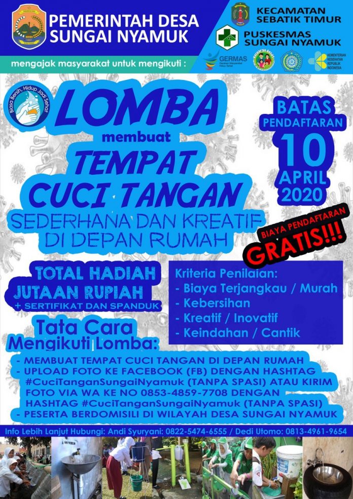 “Pendaftaran tidak dipungut biaya dan batas waktu pengiriman foto tempat cuci tangan sampai tanggal 10 April 2020. Untuk penilaian akan di laksanakan oleh tim Puskesmas Sungai Nyamuk dan Kecamatan Sebatik Timur,” tambahnya.