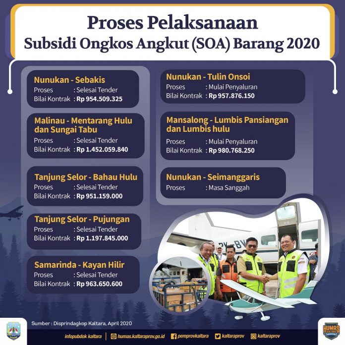 Sementara itu, untuk pelayanan SOA barang tahun ini tetap berjalan. Ini dikatakan Kepala Dinas Perindustrian Perdagangan Koperasi dan UKM (Disperindagkop-UKM) Kaltara, Hartono. “Pelayanan SOA barang sudah dilaksanakan pada rute Kabupaten Nunukan, tepatnya di Tulin Onsoi dan Lumbis Pasiangan yang digelar pada 22 April 2020,” urainya.
