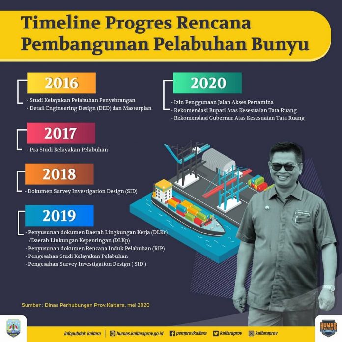Kemudian berlanjut pada 2019, diantaranya menyusun dokumen DLKr- DLKp, RIP, pengesahan studi kelayakan pelabuhan, dan pengesahan SID. Lalu pada 2020, izin penggunaan jalan akses Pertamina dari Direktur Aset Pertamina, Rekomendasi Bupati atas Kesesuaian Tata Ruang dari Bupati Bulungan, dan Rekomendasi Gubernur atas Kesesuaian Tata Ruang oleh Gubernur Kaltara. “Alhamdulillah, izin menggunakan akses jalan Pertamina sudah disetujui, tinggal menunggu proses penetapan lokasi, ini mengingat pelabuhan Bunyu merupakan pelabuhan pengumpul,” ungkap Taupan.