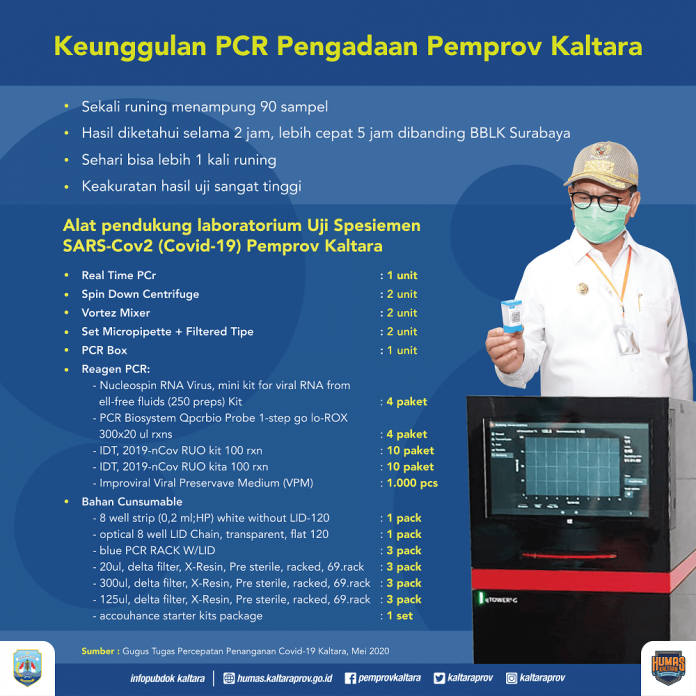 Alat PCR yang diadakan Pemprov, mampu memeriksa 90 sampel spesimen dalam waktu 2 jam. Dibandingkan dengan PCR yang dipakai di Balai Besar Laboratorium Kesehatan Surabaya, PCR di RSUD Kaltara lebih cepat 5 jam memeriksa sampel. Renovasi laboratorium pemeriksaan spesimen Covid-19 di RSUD Tarakan menelan anggaran sebesar Rp 3,2 miliar, termasuk penambahan alat tes cepat molekuler (TCM). Khusus pengadaan PCR dan reagen menelan anggaran sebesar Rp 1,8 miliar.(humas)
