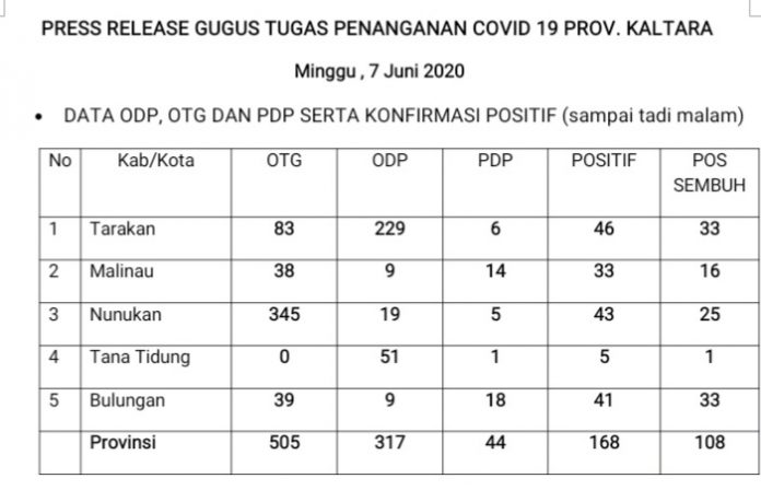 KAYANTARA.COM, TANJUNG SELOR – Jumlah terkonfirmasi positif dan sembuh bertambah per hari ini, Minggu (7/6/2020). Gugus Tugas Percepatan Penanganan Covid-19 Kalimantan Utara menyampaikan kasus positif bertambah satu orang di Kabupaten Tana Tidung (KTT).