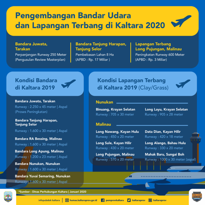 Selain dilakukan peningkatan, tahun ini juga dianggarkan melalui Anggaran Pendapatan dan Belanja Daerah (APBD) Kaltara untuk pembebasan lahan perpanjangan runway Bandara Tanjung Harapan. Luasnya 8 hektare, nilainya Rp 17 miliar.