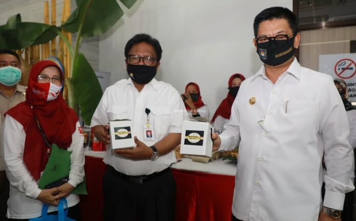 Gubernur Kaltara, Dr H Irianto Lambrie bersama Prof Dr Risfaher, Kepala Pusat Distribusi dan Cadangan Pangan BKP Kementan RI saat meninjau stan UMKM yang menjajakan produk pangan lokal non beras, Rabu (19/8)