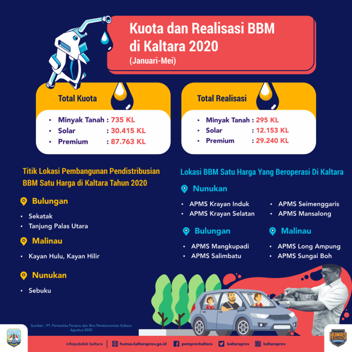 Secara keseluruhan, saat ini ada 8 titik lokasi penyaluran BBM Satu Harga di Kaltara, yakni Nunukan 4 titik yaitu APMS Krayan Induk, Krayan Selatan, Seimanggaris, Mansalong. Lalu, Malinau 2 titik yakni APMS Long Ampung dan Long Boh, serta Bulungan 2 titik yakni APMS Mangku Padi dan Salim Batu.