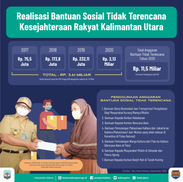 KAYANTARA.COM – TANJUNG SELOR – Dari 2017 hingga 2020, Pemerintah Provinsi (Pemprov) Kalimantan Utara (Kaltara) melalui Biro Kesejahteraan Rakyat (Kesra) telah menyalurkan Bantuan Sosial (Bansos) Tidak Terencana sebesar Rp 3,6 miliar melalui Anggaran Pendapatan Belanja Daerah (APBD) Kaltara. “Bantuan tidak terencana ini digunakan untuk membantu warga yang terkena bencana, dan untuk biaya akomodasi dan transportasi bagi masyarakat yang kurang mampu untuk berobat ke luar Kaltara,” kata kepala Biro Kesra Kaltara, Usdiansyah, baru-baru ini.