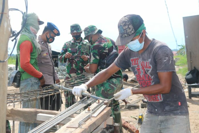 KAYANTARA.COM, TARAKAN – Prajurit Satgas Tentara Manunggal Membangun Desa (TMMD) ke 109 Kodim 0907/Trk bersama warga mulai merangkai kawat besi guna kerangka jembatan di RT 12 Kelurahan Karang Harapan Kecamatan Tarakan Barat, Jumat (25/09/2020).