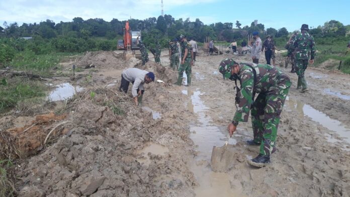 Menyikapi hal tersebut, personel Satgas TMMD memperbaiki jalan dengan membuang air yang tergenang agar badan jalan cepat kering untuk bisa dilalui kendaraan material, Kamis (1/10/2020).