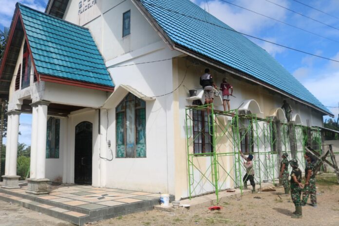Seperti yang terlihat kegiatan gotong royong di Gereja Pantekosta yang menjadi sasaran fisik tambahan TMMD ke 109, Jumat (2/10/2020).