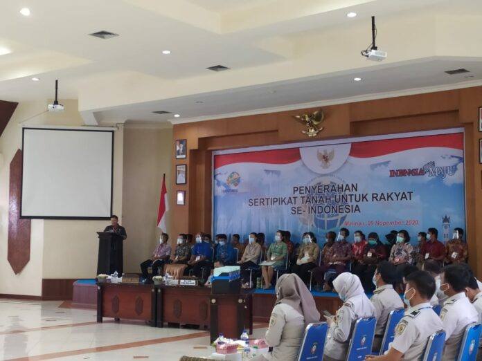 Penyerahan sertefikat tanah diberikan secara simbolis oleh Sekretaris Daerah Malinau Dr.Ernes Silvanus didampingi Kepala BPN Malinau Drs Agus Sudrajat, di ruang laga fratu, pada Senin (9/11) siang.