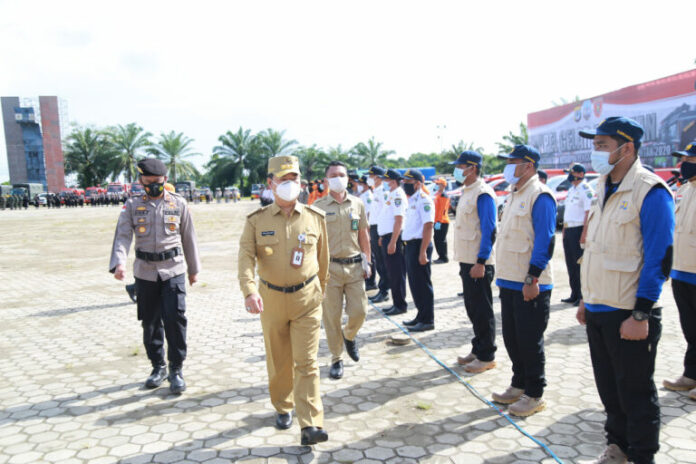 Pjs Gubernur Kaltara Teguh Setyabudi menjadi inspektur Apel Gelar Pasukan Siaga Bencana dan Kesiapan Pengamanan Pilkada Serentak 2020 di Lapangan Agathis, Selasa (17/11).