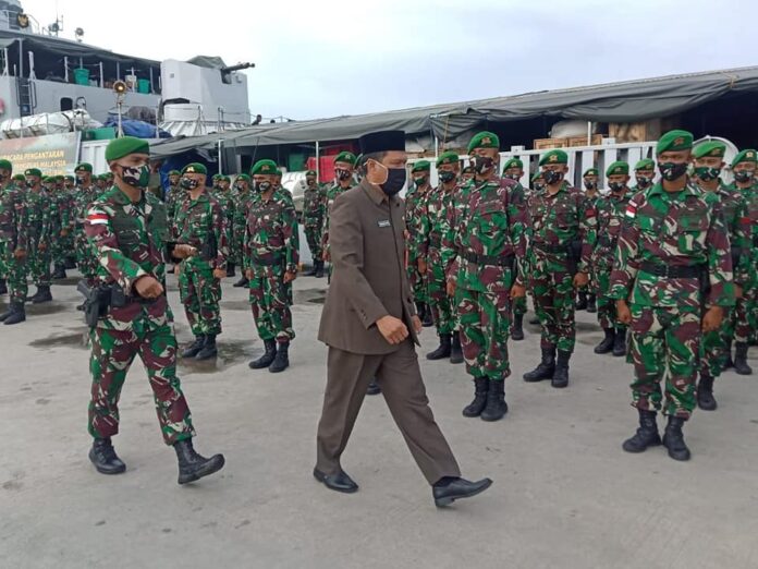 KAYANTARA.COM, NUNUKAN – Asisten Pemerintahan dan Kesra Muhammad Amin, SH., mewakili Bupati Nunukan Hj. Asmin Laura Hafid, SE., M.M memimpin upacara pelepasan Satgas Pamtas Batalyon Infantri 623/Bhakti Wira Utama yang bermarkas di Kota Banjarbaru, Kalimantan Selatan (Kalsel) yang telah selesai melaksanakan tugas pengamanan perbatasan RI-Malaysia selama 9 bulan lamanya di Kabupaten Nunukan. Upacara digelar di Dermaga Pelabuhan Tunon Taka Nunukan, Rabu (06/01/2021).