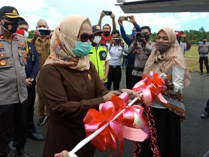 Seusai menyampaikan sambutannya, hadirin kemudian menuju Apron untuk mengikuti doa bersama serta melakukan prosesi gunting pita. Ketua DPRD Nunukan Hj. Rahma Leppa berkesempatan melakukan gunting pita sebagai tanda penerbangan subsidi ongkos angkut penumpang tahun 2021 diluncurkan. (humas)