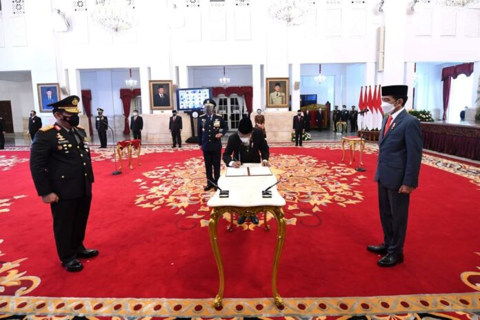 KAYANTARA.COM, JAKARTA – Presiden Joko Widodo pada Rabu, 27 Januari 2021, melantik dan mengambil sumpah jabatan Komisaris Jenderal Polisi Listyo Sigit Prabowo sebagai Kepala Kepolisian Negara Republik Indonesia (Kapolri). Acara pelantikan berlangsung di Istana Negara, Jakarta, dengan menerapkan protokol kesehatan.
