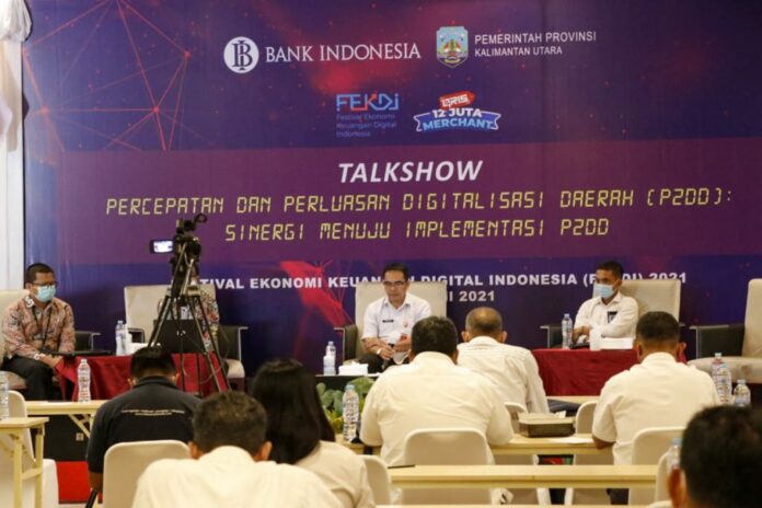 Talkshow yang bertema Implementasi Elektronifikasi Transaksi Pemerintah Daerah (ETPD) dan Pembentukan Tim Percepatan dan Perluasan Digitalisasi Daerah (TP2DD) merupakan rangkaian acara Festival Ekonomi Keuangan Digital Indonesia (FEKDI) yang dimulai sejak tanggal 05 April hingga 08 April 2021 dan diadakan secara daring maupun luring.