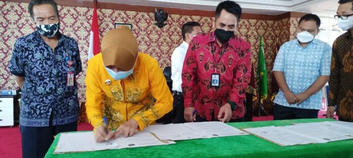KAYANTARA.COM, NUNUKAN–Bupati Nunukan Hj. Asmin Laura Hafid SE.MM melakukan penandatanganan naskah dan berita acara serah terima hibah Barang Milik Negara (BMN) dari Direktorat Jenderal (Dirjen) Cipta Karya Kementerian Pekerjaan Umum dan Perumahan Rakyat (PUPR) RI di Ruang Kerja Bupati Nunukan, Jumat (30/4).