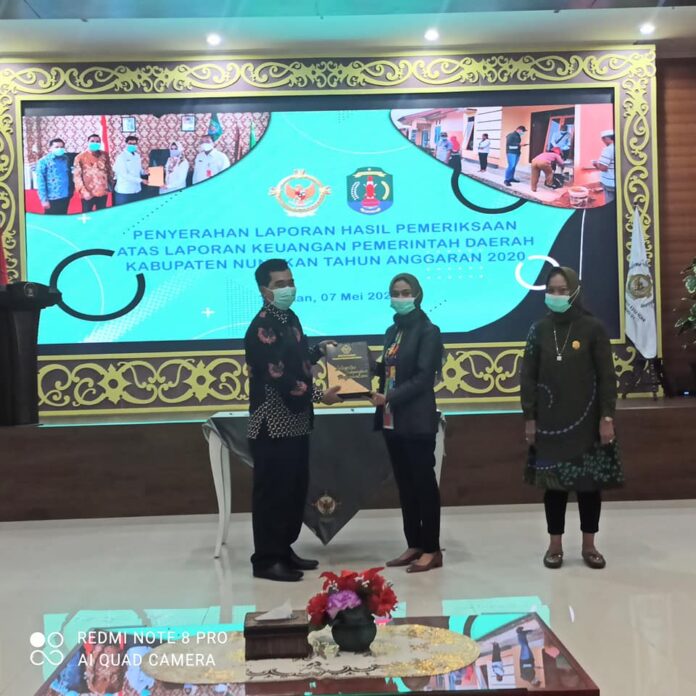Penghargaan tersebut diterima langsung oleh Bupati Nunukan Hj. Asmin Laura Hafid dengan disaksikan oleh Ketua DPRD Kabupaten Nunukan Hj. Rahma Leppa di Kantor BPK Perwakilan Kalimantan Utara di Tarakan, Jumat (7/5/2021).