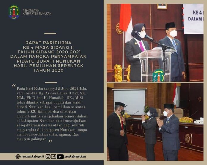 ” Pada hari Rabu tanggal 2 Juni 2021 lalu, kami berdua Hj. Asmin Laura Hafid, SE., MM., Ph.D dan H. Hanafiah, SE., M.Si telah dilantik sebagai bupati dan wakil bupati Nunukan hasil Pilkada Serentak Tahun 2020. Kami berdua diberikan amanah untuk menjalankan pemerintahan di kabupaten Nunukan demi mewujudkan kesejahteraan dan keadilan bagi seluruh masyarakat di kabupaten Nunukan, tanpa membeda-bedakan suku, agama, ras maupun golongan”, ujar Bupati.