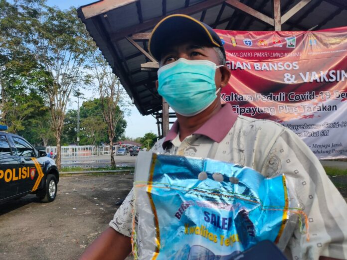 KAYANTARA.COM, TARAKAN– Merasa tidak pernah mendapatkan bantuan selama pandemi Covid-19, Ahmad Samsul Hadi (50) warga Kelurahan Pamusian, Kecamatan Tarakan Tengah mendatangi pembagian sembako yang dilakukan Polda Kaltara bersama Cipayung Plus Kota Tarakan di Pasar Tenguyun.