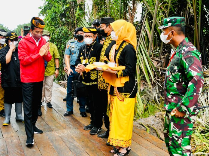 KAYANTARA.COM, TIDENG PALE – Prosesi adat tepung tawar menyambut kedatangan Presiden Joko Widodo saat tiba di Desa Bebatu, Kecamatan Sesayap Hilir, Kabupaten Tana Tidung, Provinsi Kalimantan Utara, pada Selasa, 19 Oktober 2021.