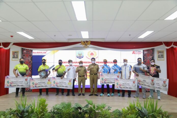 KAYANTARA.COM, TANJUNG SELOR – Gubernur Kalimantan Utara (Kaltara), Zainal A. Paliwang bersama Wakil Gubernur, Yansen TP menyerahkan berbagai penghargaan bagi atlet peraih medali pada ajang Pekan Olahraga Nasional (PON) Papua 2021.