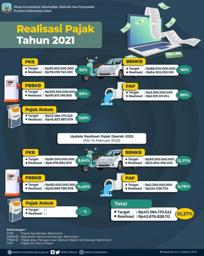 KAYANTARA.COM, TANJUNG SELOR – Realisasi pajak di Provinsi Kalimantan Utara (Kaltara) pada 2021 cukup signifikan menjadi penopang pendapatan asli daerah (PAD). Terdapat beberapa komponen pendapatan yang memberikan dampak terhadap PAD di provinsi termuda ini.