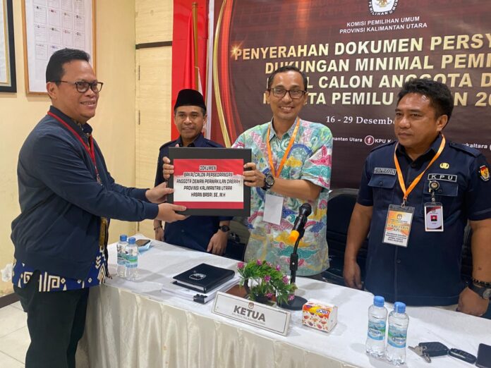 “Izinkan saya menyerahkan dokumen persyaratan dukungan minimal pemilih bakal calon Anggota DPD Peserta Pemilu Tahun 2024 beserta dokumen lainnya,” katanya di hadapan Komisioner KPU Kaltara.