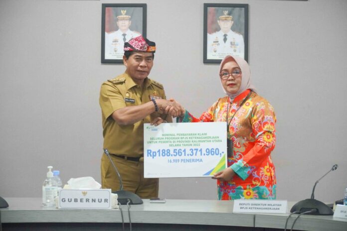 Nominal pembayaran terhadap klaim program BPJS Ketenagakerjaan di Provinsi Kaltara tahun 2022 sebesar Rp 188.561.371.960, untuk 16.989 penerima diserahkan langsung secara simbolis oleh Gubernur kepada 7 orang penerima klaim manfaat.