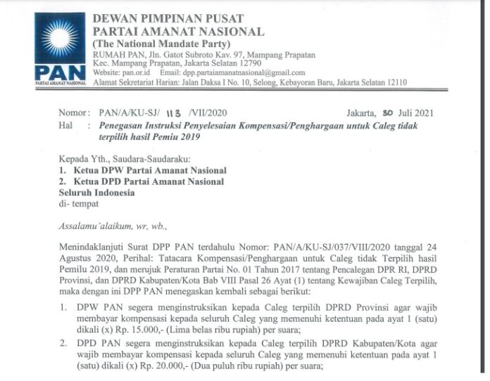 Hal ini sebelumnya telah diperkuat melalui surat DPP PAN yang ditandatangani oleh Ketua Umum, Zulkifli Hasan dan Eddy Soeparno selaku Sekjen DPP PAN pada 30 Juli 2021 silam terkait penegasan kompensasi tersebut.