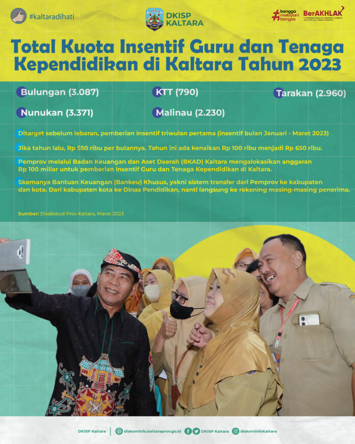 Dikatakan Kepala Dinas Pendidikan dan Kebudayaan (Disdikbud) Kaltara, Teguh Henri Susanto, penyaluran insentif Guru dan tenaga kependidikan se-Kaltara tahun 2023 ditarget pada bulan depan, tepatnya sebelum Hari Raya Idul Fitri.