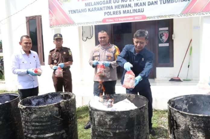 KAYANTARA.COM, MALINAU – Sebanyak 18 karung barang bukti berupa daging ayam beku dengan berat total 480,5 kg dimusnahkan Kepolisian Resor (Polres) Malinau dengan cara dibakar dan ditimbun, Rabu (13/9).