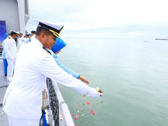 KAYANTARA.COM, TARAKAN – Komandan Pangkalan Utama TNI AL (Danlantamal) XIII Laksamana Pertama TNI Deni Hermanselaku Inspektur Upacara (Irup) memimpin upacara Tabur Bunga di Laut dalam rangka memperingati Hari Armada Republik Indonesia Tahun 2023, yang berlangsung di Geladak KRI Teluk Banten-516,. Jumat (1/12/2023).